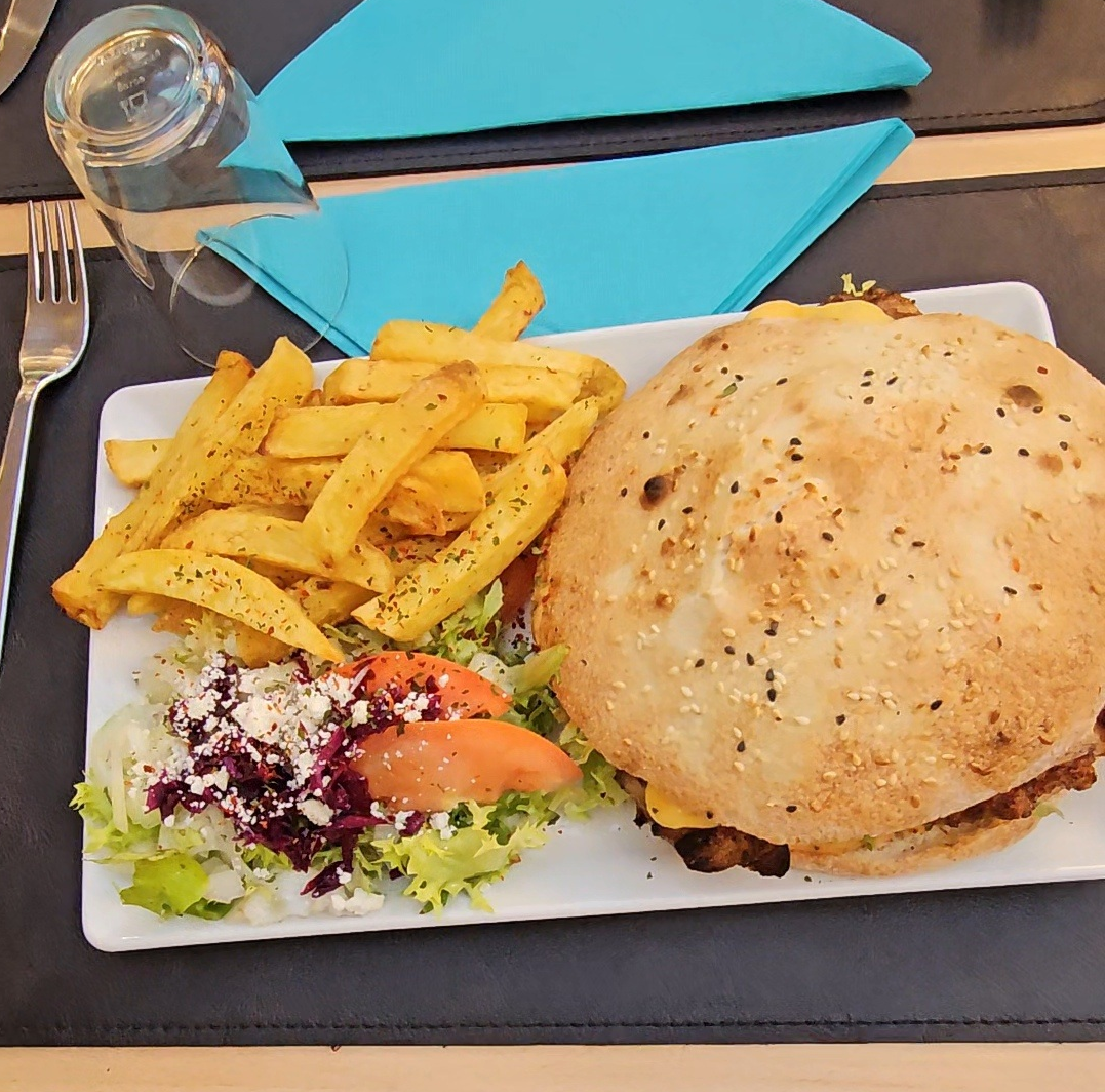 Un pain maison bien doré, garni de 300 g de poulet grillé et juteux 🍗, du cheddar fondant 🧀, de la salade fraîche, des tomates et des oignons croquants. Le tout accompagné de crudités fraîches et de frites maison croustillantes 🍟.